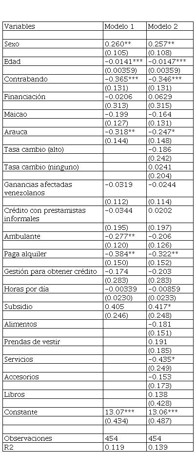 En los dos modelos se encuentra que las ganancias de las unidades productivas en Arauca son menores que en Cúcuta: 31% y 25% respectivamente para cada modelo. Con respecto a Maicao, este resultado solamente aparece en el primer modelo; en el segundo modelo, a pesar que se mantiene el signo negativo, este efecto no es estadísticamente significativo.