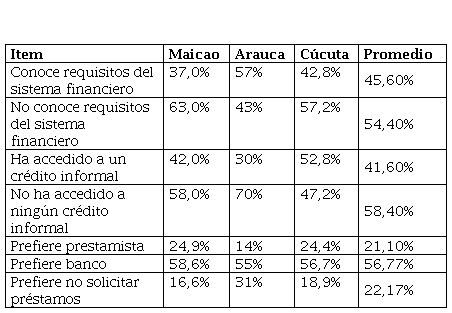 En las tres ciudades fronterizas mencionadas, el 58% de los comerciantes informales encuestados, no ha accedido a ningún crédito informal, lo que indica, que se deben generar estrategias para bancarizar al menos una parte de esta población, pues se excluyen los inmigrantes que por su condición carecen totalmente de las posibilidades de acceder el sistema financiero formal, aunque el 55% preferiría recurrir a créditos formales. De otra parte el 41% ha accedido a créditos informales, como última instancia aunque muchos prefieren no hacerlo. Esa situación refleja que el movimiento de financiación de manera informal, es para mantener el día a día del negocio y no para generar inversiones que representen un crecimiento sostenido de la actividad económica que desempeñan.