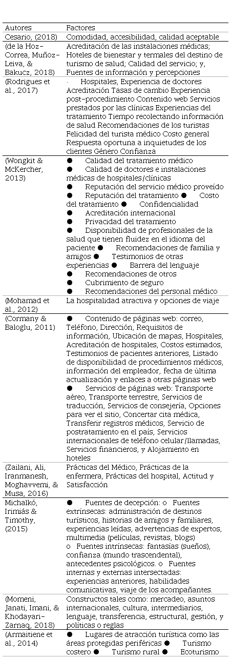 En la tabla 1 se muestran los factores que varios autores han considerado al analizar los requerimientos de los turistas al momento de realizar el turismo de salud o médico: