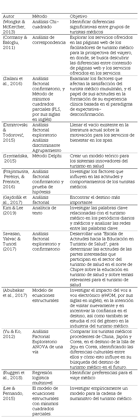De acuerdo a los objetivos que se establecen en cada estudio, se utilizan algunos métodos que apoyen el entendimiento de la información relacionada con el turismo de salud o médico, y que permita obtener conclusiones para apoyar la toma de decisiones; en la tabla 2 se muestran los métodos utilizados en estos estudios, así como el objetivo de cada estudio: