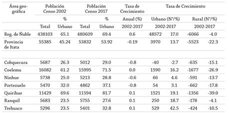 La consideración de lo rural se aleja de las perspectivas que propone el objeto geográfico campo, para permitirse contener y entregar significado a las entidades urbanas. Sin embargo, hay que hacer dos disquisiciones: en primer lugar, la mayoría de las comunas de la provincia, pierden población, principalmente se observa esta tendencia en los distritos censales considerados rurales, cuestión que no es posible de explicar por el proceso de migración campo-ciudad; y en segundo lugar, las entidades urbanas tienden a crecer en población a pesar de la pérdida de población comunal.