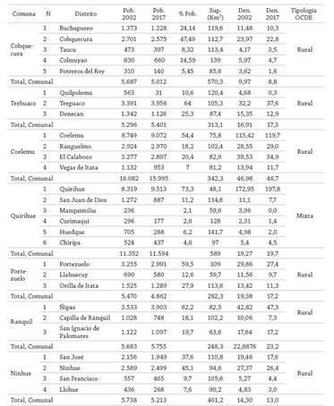 El área de estudio se ubica en la Provincia de Itata, en la recientemente conformada Región de Ñuble1. La provincia se encuentra ubicada sobre la Cordillera de la Costa, espacio de secano fuertemente erosionado y deprimido económicamente, donde las dinámicas demográficas, muestran que, el número de habitantes, tiende a decrecer, en particular en sus sectores rurales. No obstante, sus ciudades pequeñas o no metropolitanas, crecen y se expanden de manera continua, en una dinámica no profundizada aún. Estas características, sumadas a los altos porcentajes de pobreza que presenta, han determinado que sea considerada como una zona de rezago2 dentro de la Región de Ñuble.