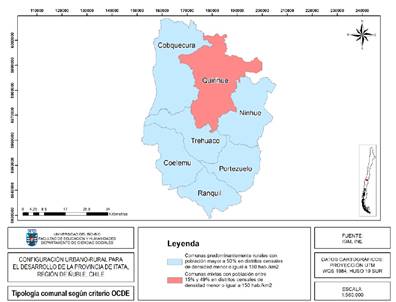 Los resultados de aplicación de estos indicadores muestran que, la mayoría de las siete comunas de la Provincia de Itata, tienen la tipificación de comunas predominantemente rurales (1), salvo la comuna de Quirihue, la cual se encuentra catalogada bajo la tipificación de carácter mixto (2). Considerando que el 27% de la población de la comuna Quirihue se encuentra en territorios cuya densidad supera los 150 hab/km2.