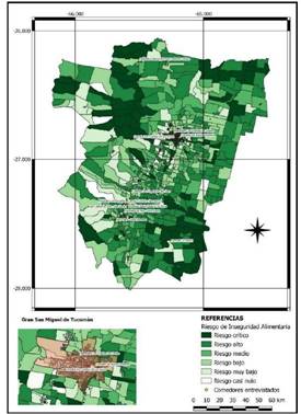 Un estudio reciente de Márquez y Salvia (2019) permitió estimar el riesgo de inseguridad alimentaria a nivel de radios censales (Mapa 1) y ubicar allí los comedores/merenderos sobre los que se aplicó la entrevista en profundidad7.
