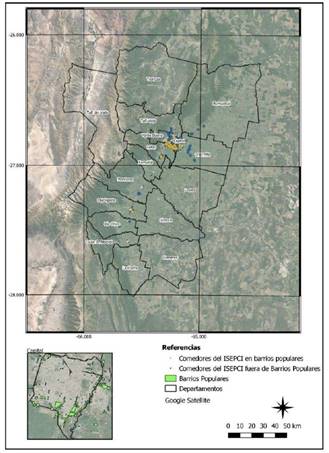 Con el objeto de profundizar el análisis del problema en escalas menores y siguiendo los postulados clásicos de la Primera Ley de Tobler (Tobler, 2004) -la cual establece la íntima relación entre la ubicación espacial de determinados objetos y el territorio-, analizamos la distribución espacial de esta muestra de comedores en relación a las problemáticas nutricionales abordadas. Cabe aclarar que el marco de acción de ISEPCI está desarrollado con mayor amplitud en ámbitos urbanos, de allí que la conformación de la muestra bajo estudio, represente ampliamente este tipo de ámbitos, mayormente localizados en los sectores marginales del Aglomerado Gran San Miguel de Tucumán y las ciudades de Monteros, Concepción y Aguilares, al sur de la provincia.