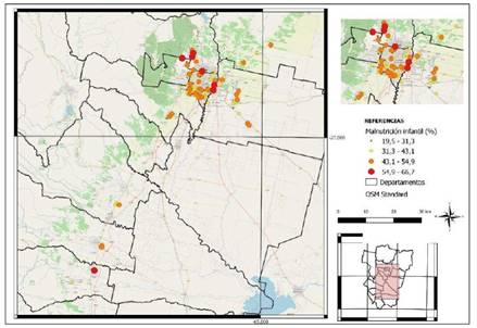 El Mapa 3 analiza la malnutrición infantil, según estos espacios de alimentación. Se observa que las prevalencias alcanzan sus magnitudes más elevadas en el sector oriental del Gran San Miguel de Tucumán, en áreas colindantes al río Salí, pero también se destacan como problemáticos algunos sectores del norte, próximos a Tafí Viejo y en Aguilares.
