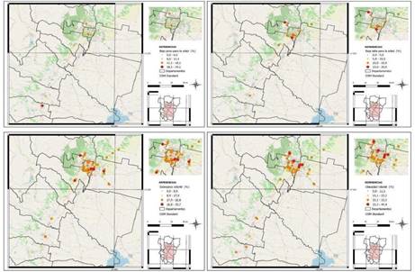 Como se ha mencionado anteriormente, los problemas relacionados con el exceso de peso han tenido un crecimiento sorprendente en los últimos años, agravados claramente en el contexto de la pandemia. El Mapa 4, en su margen inferior izquierdo, permite distinguir los puntos más críticos en materia de sobrepeso infantil. Se observan, además de prevalencias mucho más altas que los indicadores analizados, un patrón de mayor dispersión espacial. El caso más extremo se encuentra en Lules, una ciudad distante 25 km al sur de la capital, donde tal prevalencia alcanza al 35% de sus niños.