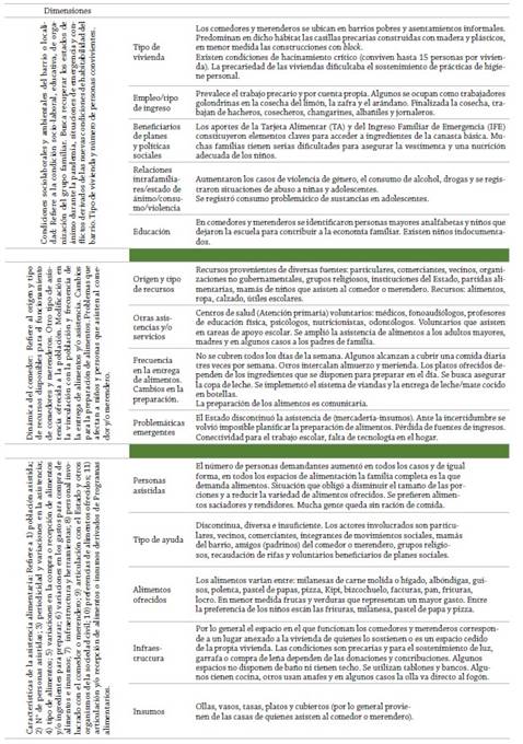 Las dimensiones que analizamos, sintetizamos y presentamos en el Cuadro 1, buscaron un acercamiento a esas variaciones, a la vez que nos permitieron identificar aspectos que atraviesan, en mayor o menor grado, los espacios de alimentación.