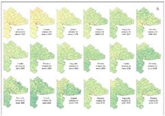 Luego, se descartaron aquellas imágenes que presentaron algunos errores en valores de píxeles o información nula y se aplicó una media al conjunto de imágenes por semana. Se obtuvieron un total de 18 imágenes representativas de cada semana durante el período marzo-julio 2020, donde los valores requirieron ser normalizados y reclasificados para su posterior comparación. Dicha reclasificación fue realizada mediante la calculadora ráster del software QGIS 3.14® y, de esta manera, se mantuvieron los valores máximos y mínimos, logrando una homogeneización de la escala de análisis.