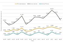 La Figura 7 refleja los valores promedio mensuales de NO₂ por columna de aire registrados por la plataforma Sentinel 5P en el área de estudio, a partir de la finalización del periodo estudiado, hasta el mes de septiembre de 2021. Dichos datos surgen de la aplicación de la metodología desarrollada a imágenes disponibles en el Catálogo de Metadatos de CONAE, en el caso puntual del partido de Bahía Blanca. Se registra que, sus valores máximos registrados en el partido (curva negra) y mínimos (curva celeste), tienden a incrementar conforme pasan los meses, al igual que la media en el partido. Cabe destacar que, los valores máximos, se corresponden con el centro y área industrial de la localidad de Bahía Blanca y, como se ha ido mencionando, las causas se correlacionan con un aumento de la circulación de la población, incremento de la actividad industrial y finalización de las restricciones, sumado a la implementación de vacunas para frenar al virus COVID-19 que estimula a la población a salir de sus hogares.