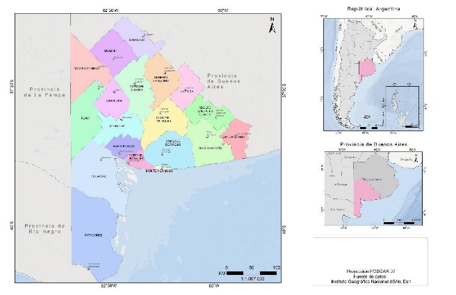 El sudoeste de la provincia de Buenos Aires, comprende un total de 19 partidos (Figura 1). Dicha región se caracteriza por la variabilidad climática, principalmente en relación a precipitaciones y temperaturas. El clima característico de la región es templado con temperaturas medias anuales que oscilan entre los 14ºC y 20ºC. Durante la estación cálida, los registros superan los 40ºC, mientras que, las menores temperaturas registran valores inferiores a los 0ºC. En relación a las precipitaciones, las medias varían entre 841,7 mm y 380 mm de norte a sur, siendo los máximos en otoño y primavera y los mínimos en los meses de invierno (Campo de Ferreras et al., 2004).