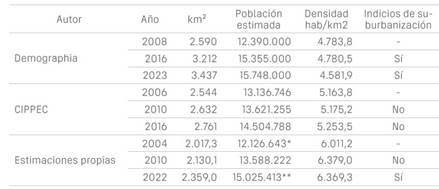 La Tabla 1 sintetiza las estimaciones de superficie y población realizadas para este trabajo (de elaboración propia), así como aquellas de Demographia y CIPPEC, lo cual permite pasar en limpio el comportamiento general de las densidades de población.