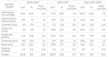 Las estimaciones propias, realizadas en el presente trabajo según la metodología propuesta por Vapñarsky (1998), arrojaron datos de superficie más moderados, aunque igualmente notables: 2.017 km2 en 2004, 2.130 km2 en 2010 y 2.359 km2 en 2022. Esto equivale a un incremento total de superficie de 342 km2 (16,9%) en 18 años, con un ritmo de crecimiento de la superficie del 0,94% anual.
