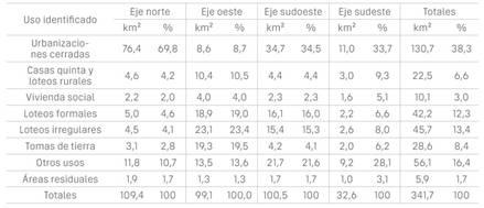 Segundo, se constata que las urbanizaciones cerradas son las protagonistas indiscutidas de la expansión, pues representan más del 38% de la superficie agregada (casi 131 km2 en apenas 18 años). Destaca también que el crecimiento de las urbanizaciones cerradas se mantuvo constante, ya que agregaron una superficie promedio de 6.6 km2/año entre 2004 y 2010, y 7.6 km2/año entre 2010 y 2022. Se distinguen cuatro grandes zonas de concentración de este tipo de urbanización: la más importante y tradicional en el eje norte (76,4 km2), las ya consolidadas, aunque ralentizadas en el eje oeste y sudeste (8,6 km2 y 11 km2, respectivamente), y la más explosiva, en el eje sudoeste (34,7 km2).