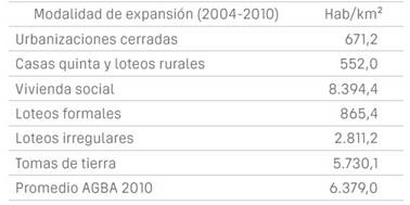 Los tres casos restantes son los que coinciden plenamente con lo que podría denominarse expansión urbana popular (Apaolaza, 2016). Una situación de transición aparece con los loteos irregulares, que presentan una densidad de 2.811 hab/km2, valor igualmente bajo en relación a la densidad promedio de la aglomeración. La densidad de las tomas de tierra (5.730 hab/km2) se ubica en valores cercanos al promedio de la aglomeración, por lo que podría inferirse que su efecto sobre las densidades generales tendería a ser nulo. Por último, aparece la vivienda social, que representa el caso de expansión residencial de más alta densidad (8.394 hab/km2), con valores por encima del promedio de la aglomeración.