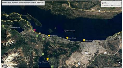 La playa Bahía Serena se ubica en el kilómetro 12.200 de la Av. Ezequiel Bustillo, en el sector oeste de la ciudad y, debido a su emplazamiento en una geoforma de bahía, posee una playa mayormente de arena. Esta característica rompe con la generalidad, dado que las playas de costa de lago generalmente son de rodado patagónico o grava de mediano tamaño. Cuenta con una superficie estimada de 6.580 m2, lo cual le otorga una condición ambiental singular por su extensión, como sitio para el esparcimiento y la práctica de deportes acuáticos. Además, es un hábitat para aves protegidas por el PNNH y uno de los tres sitios sobre la costa del lago homónimo, con acceso público a playa, que posee una señalización para el ingreso de vehículos con embarcaciones hasta la orilla (Figura 1).
