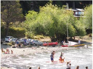 Según un estudio efectuado por la Dirección Provincial de Catastro (Müller, 2013) en este sector de borde de ciudad se identificaron 48 (cuarenta y ocho) bajadas para el lago Nahuel Huapi entre playas, pasajes peatonales, espacios verdes/reservas fiscales, calles, puertos y zonas de costanera, entre otros. No obstante, durante la pandemia por COVID-19 solo dos de un total de cinco playas habilitadas como balneario (Bahía Serena y Playa Bonita, ambas en el noroeste de la ciudad) han mantenido un servicio regular de guardavidas con prestación de servicios turísticos –habilitados por la municipalidad- tales como: buceo con instrucción, kayak tipo siton top y stand up paddle.