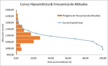 Curva Hipsométrica: Expresa el potencial evolutivo de la cuenca hidrográfica, por medio de un gráfico de dos ejes, donde la ordenada representa la Altura relativa (h/H) y la abscisa el Área relativa (a/A), donde h es el Intervalo entre curvas de nivel (m), H es el Desnivel total de la cuenca (m), A es la superficie total de la cuenca (km) y a es el área entre curvas de nivel (km²).
