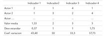 Posteriormente se aplicó un análisis estadístico de las respuestas por grupo de actor, buscando determinar la representatividad de los valores de incidencia de cada indicador. La relación entre la desviación estándar de las respuestas y la media permitió definir un coeficiente de variación entre respuestas del mismo tipo. En los casos donde la media no fue representativa del grupo encuestado (Coef de variación > 80), se realizó una nueva ronda de preguntas a los entrevistados que hubieran mostrado valores de respuesta más alejados de los valores medios.