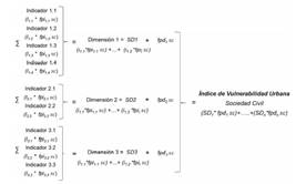 El Índice de vulnerabilidad urbana (IVU) es el producto final del presente trabajo y se constituye en la síntesis de todas las dimensiones, variables e indicadores involucrados según la visión de los distintos actores en la definición del grado de vulnerabilidad urbana. Para su cálculo se procedió en primer lugar a la sumatoria de los valores de cada indicador normalizado y ponderado según su peso estipulado en cada dimensión. La sumatoria de estos valores de vulnerabilidad por indicador, dieron como resultado un subíndice correspondiente al grado de vulnerabilidad urbana de la dimensión considerada, tal como muestra la siguiente formula: