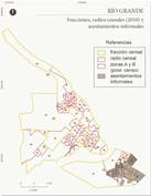 Se trabajó en dos escalas de análisis2. A nivel urbano, en la ciudad de Río Grande como caso de estudio, estableciendo criterios de vulnerabilidad para la totalidad urbana. La unidad de análisis considerada para la medición de la vulnerabilidad fue el radio censal, lo cual permitió compatibilizar información generada tanto en áreas formales como en asentamientos informales y establecer criterios de comparabilidad de resultados. Como unidades susceptibles de intervención, se identificaron asentamientos informales de la ciudad según lo propuesto por Fank (2019), en un trabajo que incluye localización geográfica y características socio-urbanas de los mismos. La Figura 2 muestra el mapa actualizado de asentamientos informales.