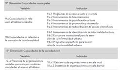 9° Dimensión. Capacidades Estatales: limitan o posibilitan las condiciones de acceso al hábitat de todos los habitantes, y particularmente de los pobladores de asentamientos informales. Los instrumentos de gestión tienen incidencia directa en la configuración territorial (Reese, 2011). Los habitantes son más o menos vulnerables en función de las capacidades que muestren los actores estatales de implementar instrumentos múltiples y variados, para prevenir situaciones de exclusión urbana y para mitigar impactos en situaciones existentes.