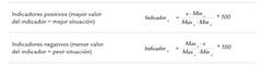 Dado que los indicadores correspondientes a las distintas variables se encuentran en diferentes unidades de medida y con diferentes rangos de valores, resultó necesaria su estandarización (Monsalve León, 2010). Por ello, los valores resultantes de su medición se transformaron en unidades adimensionales que permiten realizar comparaciones, utilizando el sistema de los mínimos y máximos (PNUD, 2000). Para la normalización de indicadores se definieron rangos numéricos en un intervalo desde 0 hasta 1, lo cual permitió identificar grados de vulnerabilidad, donde 1 corresponde al valor máximo de vulnerabilidad y 0 al valor mínimo. La fórmula de cálculo de los puntos en relación a la dirección positiva o negativa de cada indicador (según la naturaleza de cada variable) se muestra en la Tabla 4: