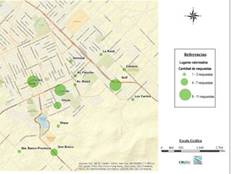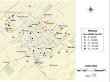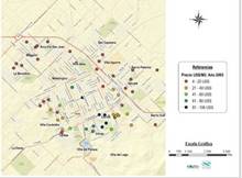 Por su parte, en el Mapa 3 se observa el precio del metro cuadrado de los terrenos en venta para el año 2000. En este caso, los valores oscilaban entre 3 y 103 dólares el metro cuadrado. Los lotes más valorizados se ubicaban al sur y centro del ejido urbano, siendo los barrios Cerrito y Uncas los que concentraban la mayor cantidad de avisos. Los barrios pertenecientes a las periferias noreste (San Cayetano, Villa Aguirre, Palermo y Selvetti), noroeste (Arco Iris, San Juan y Maggiori) y el barrio Tunitas, contaban con muy pocos datos y todos ellos con precios relativamente bajos.