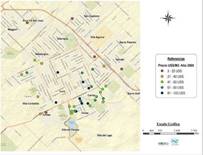 Para el año 2005, según se aprecia en el Mapa 4, el rango de valores no varió demasiado con respecto al 2000, fluctuando entre 4 y 106 dólares el metro cuadrado. Tampoco se observan diferencias significativas en lo que se refiere a la distribución de esos valores hacia el interior de la ciudad. Aunque sí aparece una mayor cantidad de datos correspondientes a los barrios periféricos y menos valorizados, a los que se suman, además de los mencionados para el año 2000, La Movediza y Villa Laza, ubicados en el noroeste del ejido urbano.