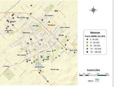 Sin embargo, para el año 2010 se percibe que los precios se incrementaron notablemente, alcanzando un máximo de 188 dólares el metro cuadrado. Como se visualiza en el Mapa 5, los valores más altos se registraron en el centro de la ciudad, mientras que los de los siguientes rangos, también mucho más elevados que en el año 2005, se ubicaron en los barrios del sur, especialmente Uncas y Cerrito, a los que se adicionó también el barrio Golf. La periferia norte continuó mostrando una densidad importante de ofertas, aunque de bajos valores relativos. Este último dato puede explicarse debido a la mejora relativa del poder adquisitivo de la población trabajadora durante los años precedentes, que comenzaron a demandar parcelas para la construcción de viviendas como bien de uso, lo cual incentivó a los propietarios de terrenos en la periferia norte a fraccionarlos y venderlos.