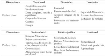 Según las autoras, la alimentación debe ser analizada desde la complejidad de todas sus fases: la producción de semillas, el cultivo, la selección y preparación de los alimentos, y todo lo que ocurre previo a ser ofertados en el mercado para asegurar su salubridad (Izquierdo Hernández et al., 2004, como se citó en Crotta et al., 2024). Allí, se sintetizaron en seis dimensiones las aristas de la alimentación saludable (Tabla 1), las cuales fueron indispensables para analizar las experiencias de CCC en Santiago del Estero.