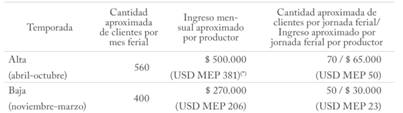 Para que la feria sea posible, el INAFCI, en trabajo conjunto con el INTA, gestionan los permisos necesarios en la Municipalidad de las Termas y se encargan de conseguir y resguardar los insumos y los materiales que los productores precisan. Por otro lado, tanto la cantidad de clientes por jornada como los ingresos, varían de acuerdo con la temporada (Tabla 2).