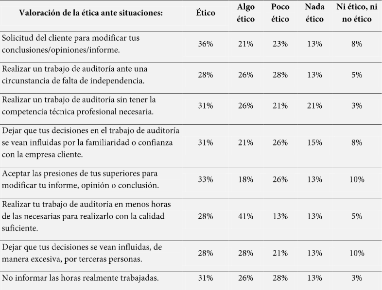 Llama la atención que aun cuando el porcentaje de mayor aceptación por pregunta es ético, existe un gran porcentaje que se concentra en poco ético y nada ético, destacándose la realización de un trabajo de auditoría sin tener la competencia técnica profesional necesaria y la realización de un trabajo de auditoría ante una circunstancia de falta de independencia.