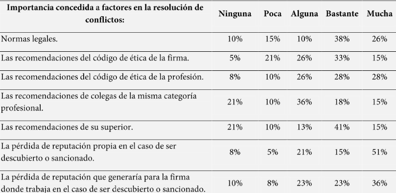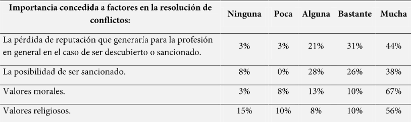 Los resultados indican que los encuestados en la resolución de conflictos o dilemas éticos se fundamentan en sus valores morales, en la posibilidad de ser sancionado y en la pérdida de reputación que su actuar podría ocasionar para la profesión. Es decir, el profesional, aun cuando tiene actuaciones no adecuadas, es precavido por las consecuencias de sus actos.