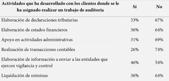Es importante este resultado, pues indica que los auditores, en su proceso de revisión, análisis y evaluación de la razonabilidad de los estados financieros, realizan actividades que no corresponde a su función, lo que genera sesgos e imparcialidad en los informes de auditoría y va en contravía de las normas profesionales y de ética, como lo son la independencia y objetividad, afectando así los informes de auditoría.