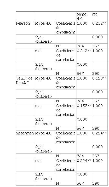 Sobre los resultados para la comprobación de la hipótesis H, en la Tabla 3.3 se puede observar que hay una correlación de Pearson débil de 0.212 (Hernández et al., 2018), con un nivel de significancia de 0.01 entre la responsabilidad social corporativa y la mype 4.0; de la misma manera se realizó la prueba Taub de Kendall, obteniendo un valor de 0.158, con un nivel de significancia de 0.01, en la prueba de Spearman el resultado fue de 0.224 al nivel de significancia de 0.01, por tanto, se rechaza la hipótesis H1: La responsabilidad social corporativa en ISO 26000 está integrada en la mype 4.0.