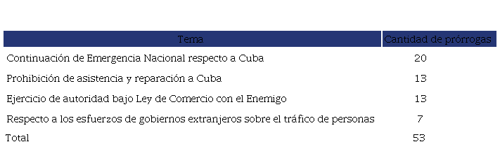 En la tabla 2 se exponen, para mayor claridad, las temáticas que abarcaron los tres mandatos presidenciales y la cantidad de veces que se prorrogaron en el período estudiado. Las 53 prórrogas muestran un marcado carácter político, y en el caso de las 13 que se derivan de la Ley de Comercio con el Enemigo se mezclan con las afectaciones a los negocios.