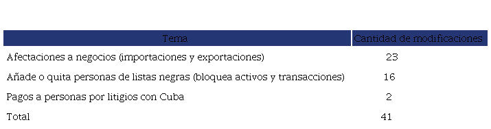 En la tabla 3 se exponen las temáticas que abarcaron y la cantidad de veces que se modificaron en el período estudiado. En este caso la totalidad de las modificaciones afectaron de una forma u otra a los negocios entre Estados Unidos y Cuba, pero también de esta última con terceros países, sobre todo por el clima de inestabilidad que mencionábamos.