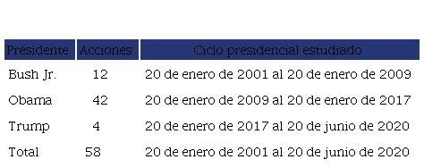 Se escogió el 20 de enero del año 2001 como punto de partida, porque marca el comienzo del período presidencial de Bush Jr. Además, el 11 de septiembre de ese mismo año se produjo el atentado terrorista contra las Torres Gemelas, lo cual implicó la promulgación acelerada de legislaciones como la Ley Patriótica contra el terrorismo (107th Congress, USA, 2001) que llevó la extraterritorialidad de las sanciones a límites no vistos con anterioridad. Posteriormente se realizó un corte en junio de 2020 para procesar los resultados más actuales posibles. A continuación se efectuaron triangulaciones de sanciones y medidas que aliviaron el bloqueo, con los mandatos presidenciales, para analizar su contenido buscando patrones. Por último, profundizamos brevemente en las sanciones que afectan a la salud cubana, porque es uno de los temas más sensibles para la población y aunque constituye una de las temáticas aparentemente intocables en el Derecho Internacional, la práctica demostró lo contrario.