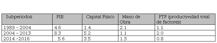 Las estimaciones de fuentes de crecimiento incluidas en el cuadro arriba están basadas en un modelo Solow de función de producción (Mankiw, N.G.; Romer, D. & Weil, D.N., 1992)., el cual explica el comportamiento de la economía en los últimos 30 años (a partir de 1989), a la vez que sirve para proyectar el crecimiento potencial del PIB a largo plazo. El análisis desagregó la expansión de los factores de producción en capital físico y mano de obra, junto con la productividad de ambos en tres subperíodos durante 1989-2016. Al desagregarse la función de producción se logró identificar cuando comenzó a debilitarse el crecimiento del capital, mano de obra, y productividad de ambos factores. Ello permitió auscultar cómo dichas pérdidas influenciaron el patrón de crecimiento.