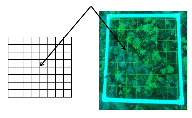 Cobertura de sustratos: Para la caracterización de los fondos se utilizó la metodología descrita por Chasquí-Velasco (2008), para sitios donde predominan las comunidades coralinas. Esta metodología considera la utilización de un cuadrante de 0.5 m x 0.5 m, dividido en subcuadrantes. En cada cuadrante se registró el tipo de sustrato presente bajo cada uno de 49 puntos de intersección más la esquina superior derecha (Figura 1). Debido a lo limitado del tiempo de inmersión se registró cada punto en fotos y videos para realizar las evaluaciones en el laboratorio, con base en dicho registro.