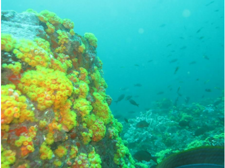 La parte superior del bajo presentó una diversidad de hábitats definidos por las grietas y espacios entre rocas, donde se ubican formaciones coralinas aisladas, corales ahermatípicos, corales blandos e invertebrados marinos (Figura 3). Esta zona es visitada por cardúmenes de pargos, roncadores, jureles, barracudas y continuamente se observan tiburones puntiblanco descansando posados sobre los canales y bajos arenosos. También el área es visitada por tortugas marinas, que lo utilizan como estación de limpieza.