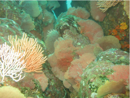 Sur: Es un área con una pendiente vertical, desde la parte superior (23 m) hasta la primera terraza (34.5 m), lo que representa una caída de unos 10 m. Desde esta terraza continúa descendiendo el montículo hasta profundidades no accesibles por el buceo autónomo convencional. El fondo de este sector está constituido por roca desnuda, que aportó el 54.29% de la cobertura, seguido de coral ahermatípico (15.14%), algas incrustantes (9.43%), anémonas (7.71%) y esponjas incrustantes (6.86%) (Cuadro 1).