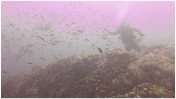 Agregaciones reproductivas de lábridos: el 29 de octubre a las 2:00 pm se observó sobre la cúspide de Bajo 20 agregaciones de desove de Thalassoma lucasanum (viejita arcoíris). Este evento se observó nuevamente el 30 de noviembre. Los peces se presentaron dispersos alrededor de la parte alta del montículo submarino y por un espacio corto de tiempo se congregaron en pequeños grupos de desove, liberando los productos sexuales de color blanquecino (Figura 4).