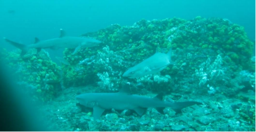 Reproducción de tiburones: en Bajo 20 se observó la presencia de tiburones puntiblanco de arrecife (Triaenodon obesus) en cortejo, donde dos machos acosaban a una hembra (Figura 5).