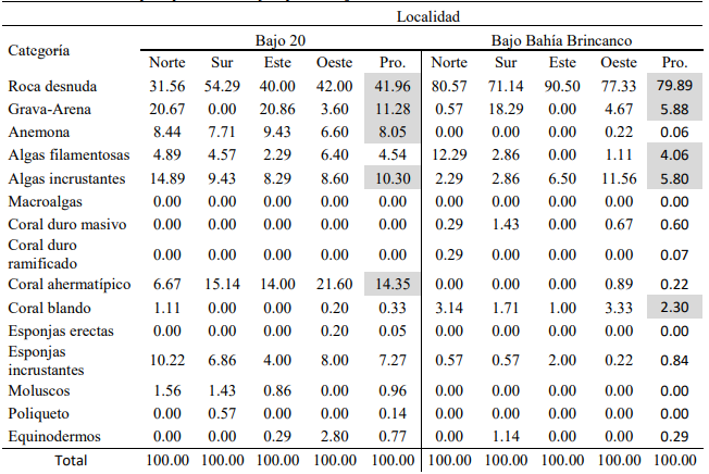 Al comparar ambos sitios podemos observar que tres de los primeros cinco sustratos dominantes son comunes: roca desnuda, grava-arena y algas incrustantes. Las diferencias ocurren por el porcentaje que aporta cada sustrato y por el hecho que en Bajo 20 se incluyen entre los primeros cinco sustratos las anemonas y los corales ahermatípicos y en Bajo Bahía Brincanco, las algas filamentosas y los corales blandos. Los fondos dominantes en ambos montículos submarinos son de tipo rocoso, con 41.96% y 79.89% para Bajo 20 y Bajo Bahía Brincanco, respectivamente. Los valores estimados para ambos bajos son similares a los estimados para el Parque Nacional Natural Gorgona, área protegida y sitio patrimonio de la Humanidad en el Pacífico colombiano, donde los sustratos rocosos se estimaron entre 44.2 y 94.5% para 6 sitios de buceo con características de montañas rocosas y bloques sumergidos (Palacios-Otero y Muñoz, 2012).