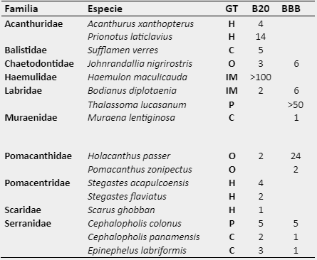 Glynn, Enochs, Afflerbach, Brandtneris y Serafy (2014) comunican para Isla Uva, Archipiélago de las Contreras, en el PNC, 57 especies de peces asociadas a dicho arrecife, acumuladas a lo largo de 20 años de monitoreo, donde predominaron las especies carnívoras. Para ambos bajos evaluados en este estudio, con un muestreo muy puntual, se reportan 16 especies, poco menos del 33% de las especies reportadas para Isla Uvas. Sin duda, con un mayor esfuerzo de muestreo debe aumentar de manera importante el número de especies asociadas a ambos bajos, sobre todo si se evalúa la diversidad y abundancia, desde la cima de los montículos hacia los costados, hasta aproximadamente 35 m de profundidad.