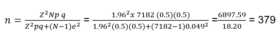Se planteó la necesidad de seleccionar una muestra aleatoria que permitió hacer generalizaciones sobre la población con un margen máximo de error del 4.9% con un nivel de confianza de 95%. Eso significa que se utilizó una muestra de 379 adultos mayores de la población bajo estudio. Obtenida de la siguiente manera: