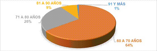 En la figura 3 en relación con la edad de los encuestados, alrededor de un 64% de los entrevistados tenían entre 60 y 70 años y más o menos un 26% entre 71 y 80 años, un 9% en el rango de 81 y 90 años y el 1% tenía 91años y más.