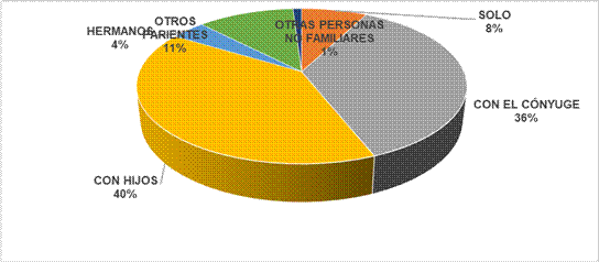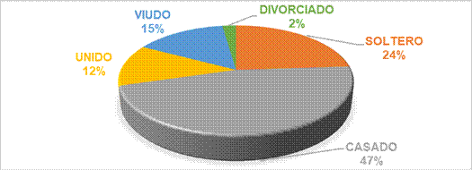 El 41% de los adultos mayores contemplados en el estudio resultó estar soltero, viudo o divorciado, esta situación propone un alto nivel de vulnerabilidad de esta población y, por lo tanto, la necesidad de atención por parte de instituciones orientadas hacia los adultos mayores.